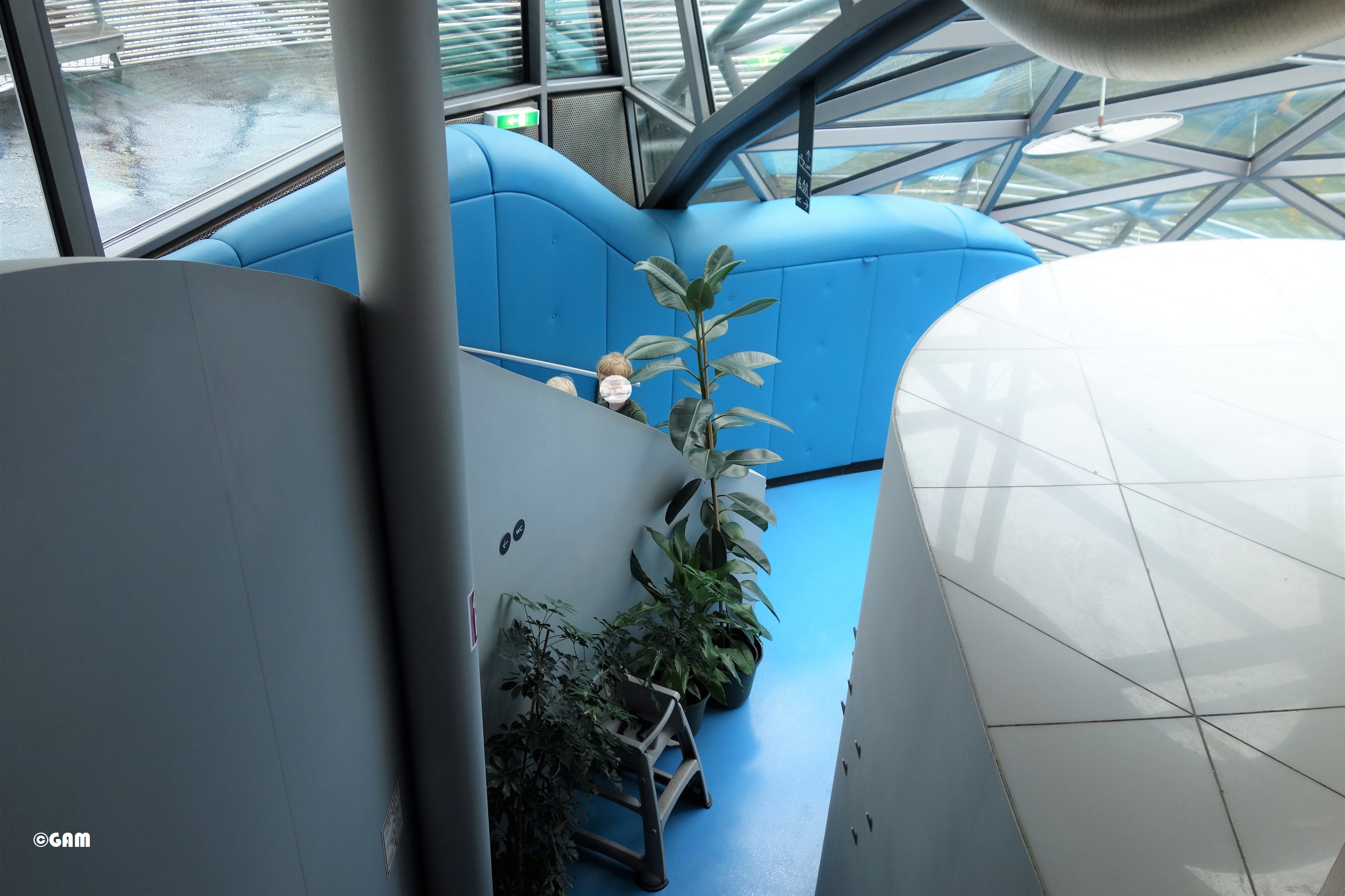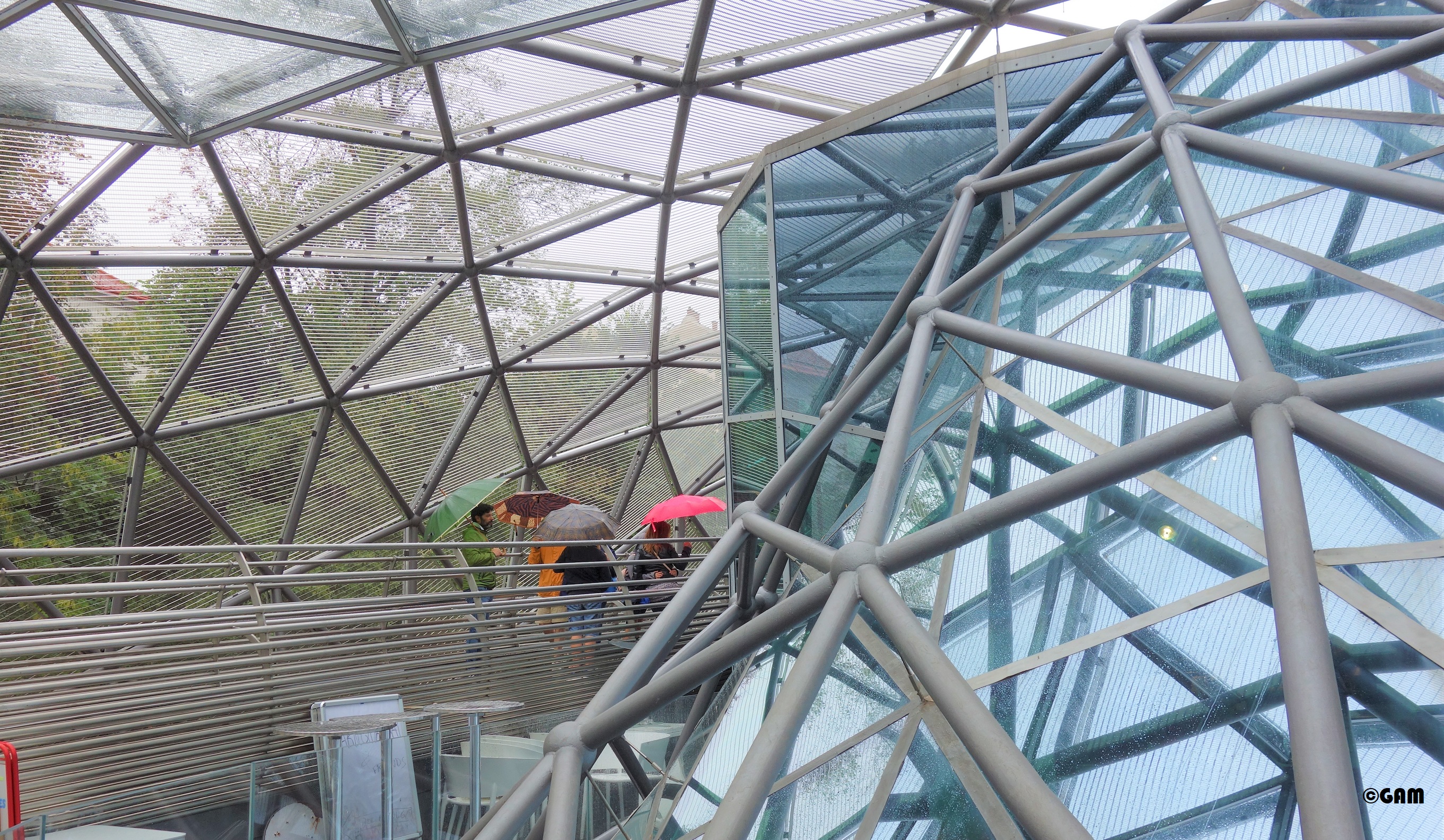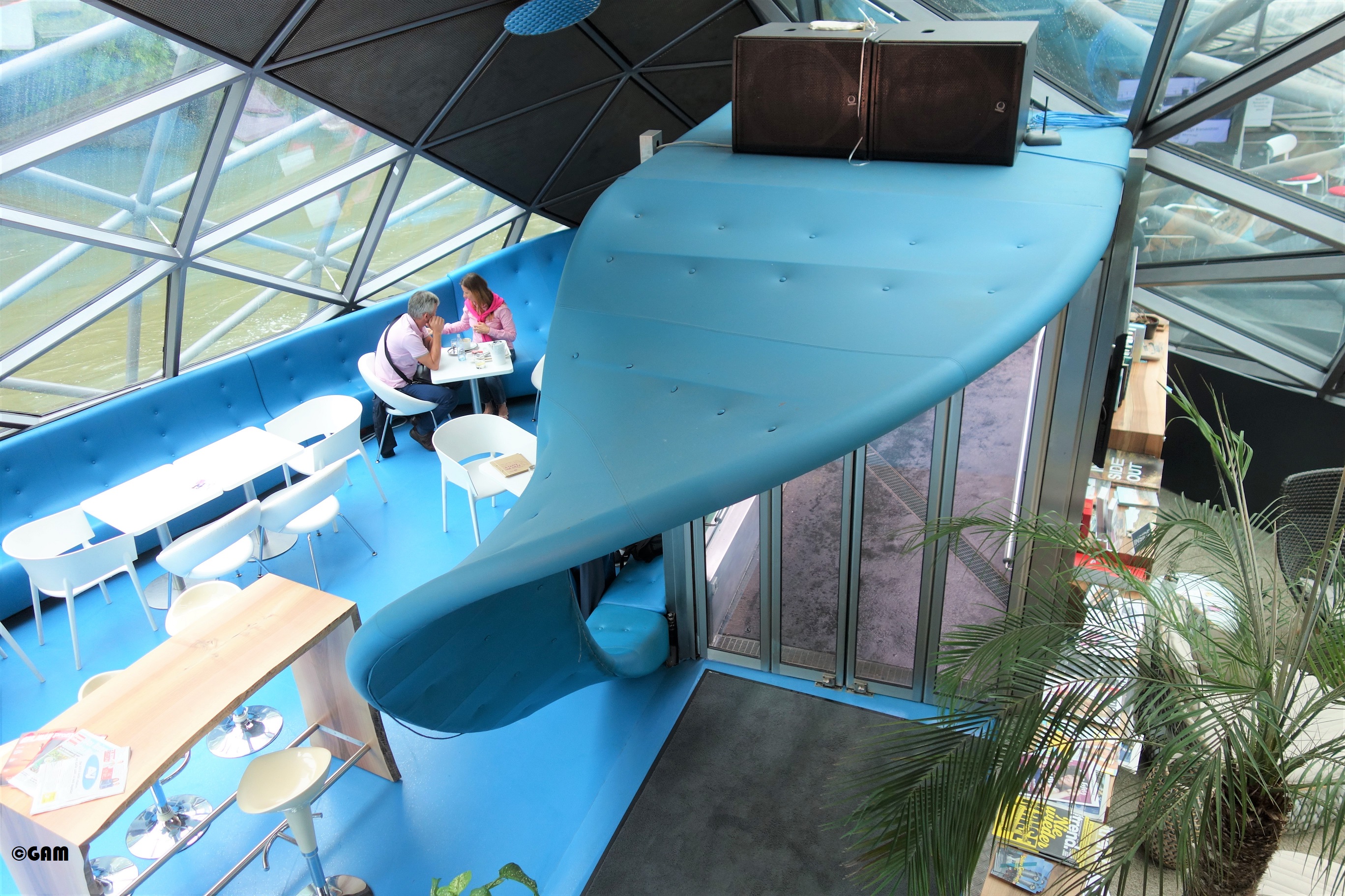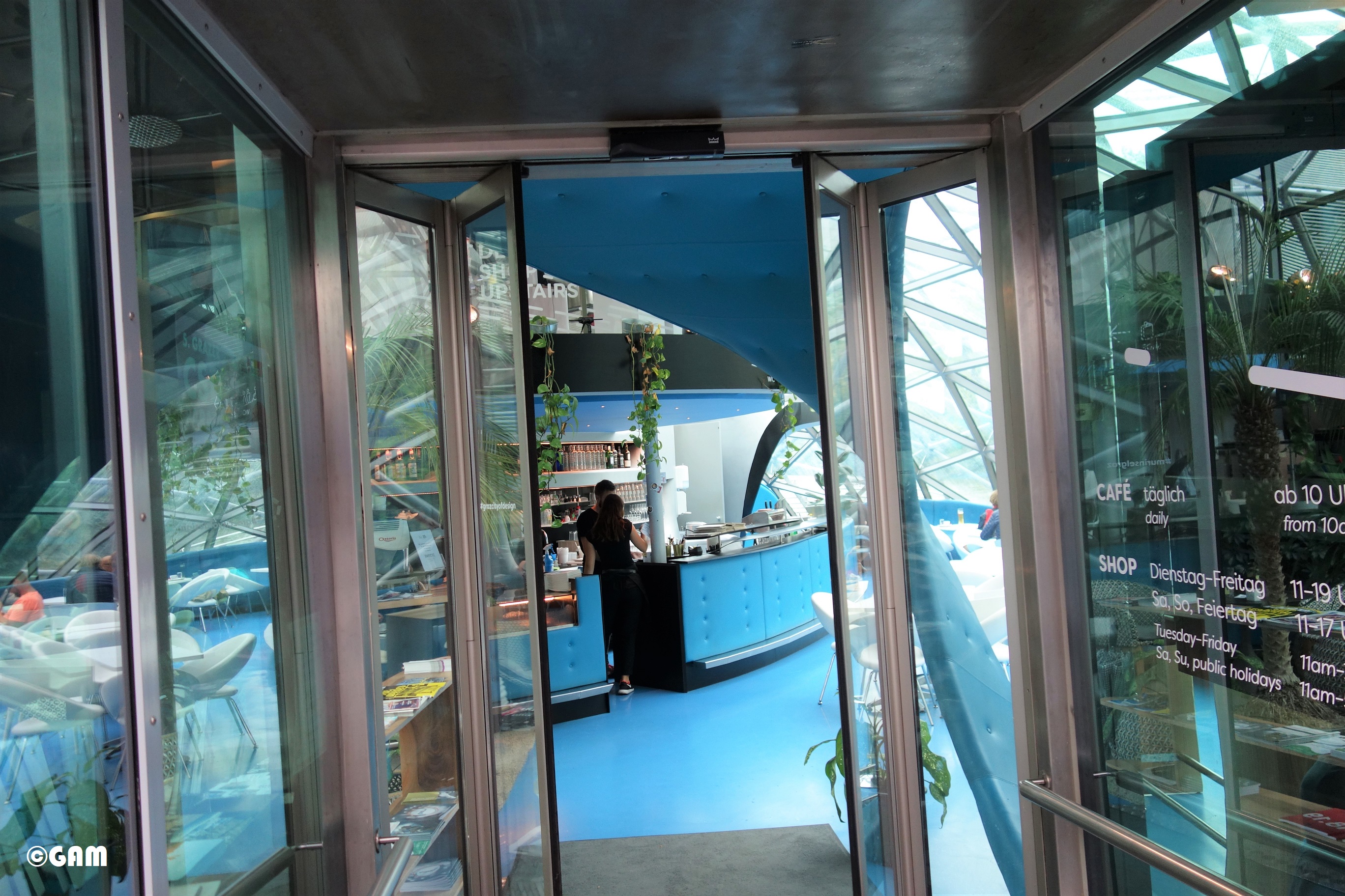 According to Robert Punkenhofer, founder and director of Graz Art and Creativity, New York artist and designer Vito Acconci created a spectacular object: a 50-metre-long, 20-metre-wide shell-shaped object with combination of an amphitheatre and a circular “Dom” (the artist calls it a cathedral-like dome). The artificial landscape is interspersed with dome and shell motifs, and can accommodate 350 visitors. This art platform allows anyone to communicate with the arts. The Murinsel is like a ship anchored in the river. The exterior is made up of two staggered bowl-shaped steel meshes, one facing upwards and one facing down, with indoor space, like yin and yang. This tai-chi design concept completely subverts the established concept of the theatre building. Inside the “Dom” there is a cafe (Island Cafe) and a children’s playground. The sky-blue floor in the cafe, the white tables and chairs and the palm trees are eye-catching. They made me feel the illusion of a tropical island club. The design of the blue glass adds some mystery. The area of the theatre is also dominated by sky blue and white design, which is much lighter compared to a large amount of stainless steel.
