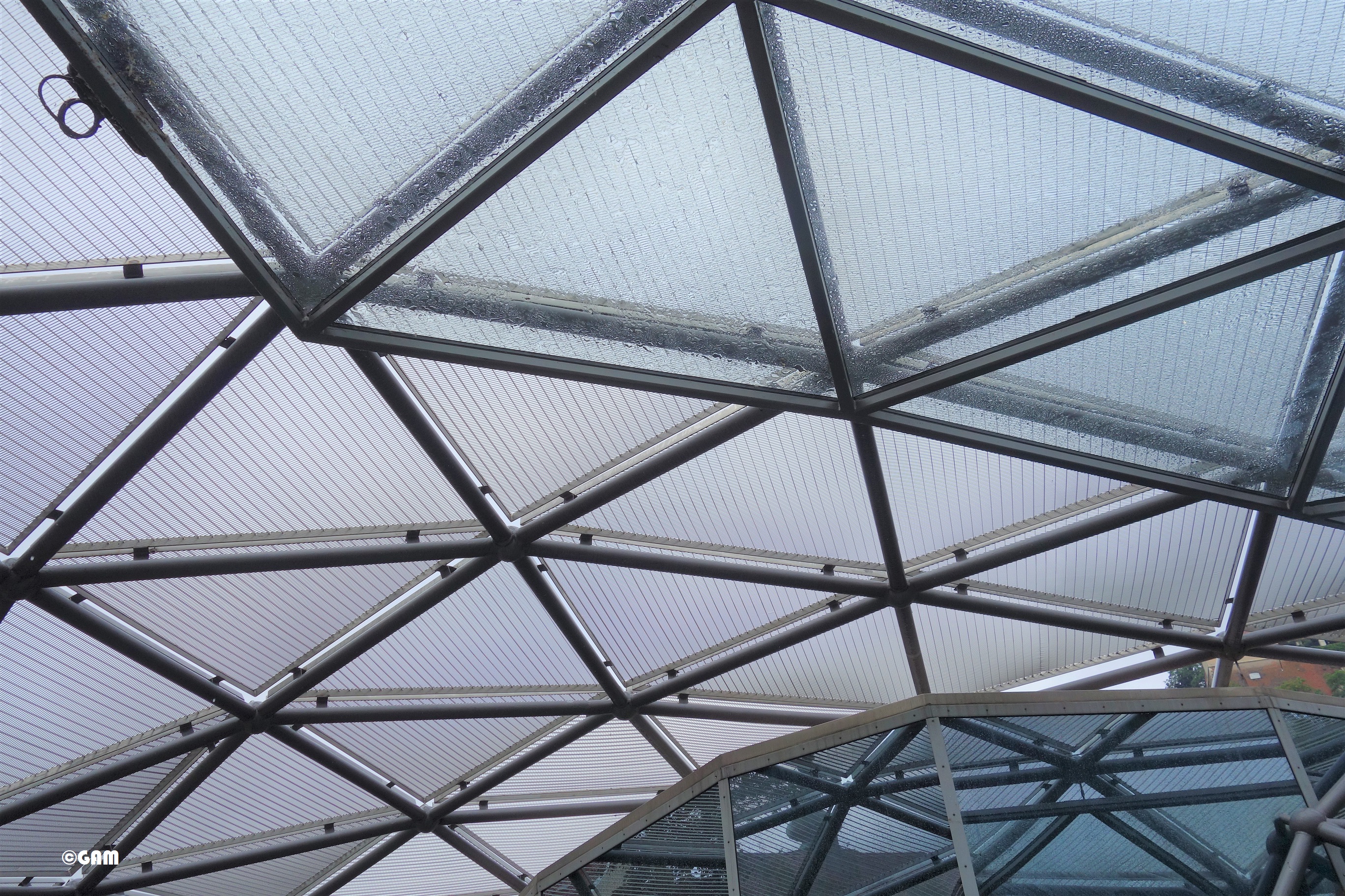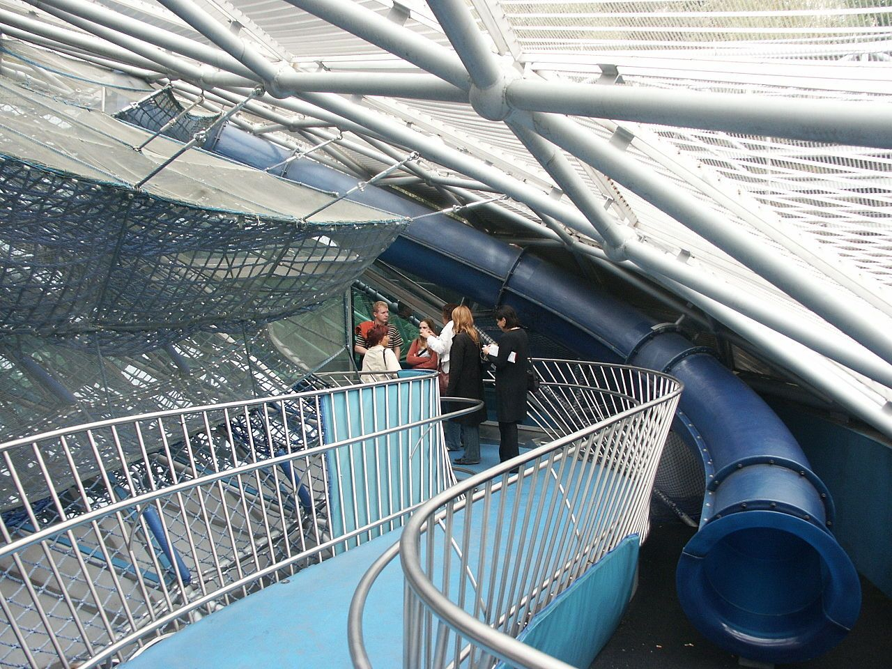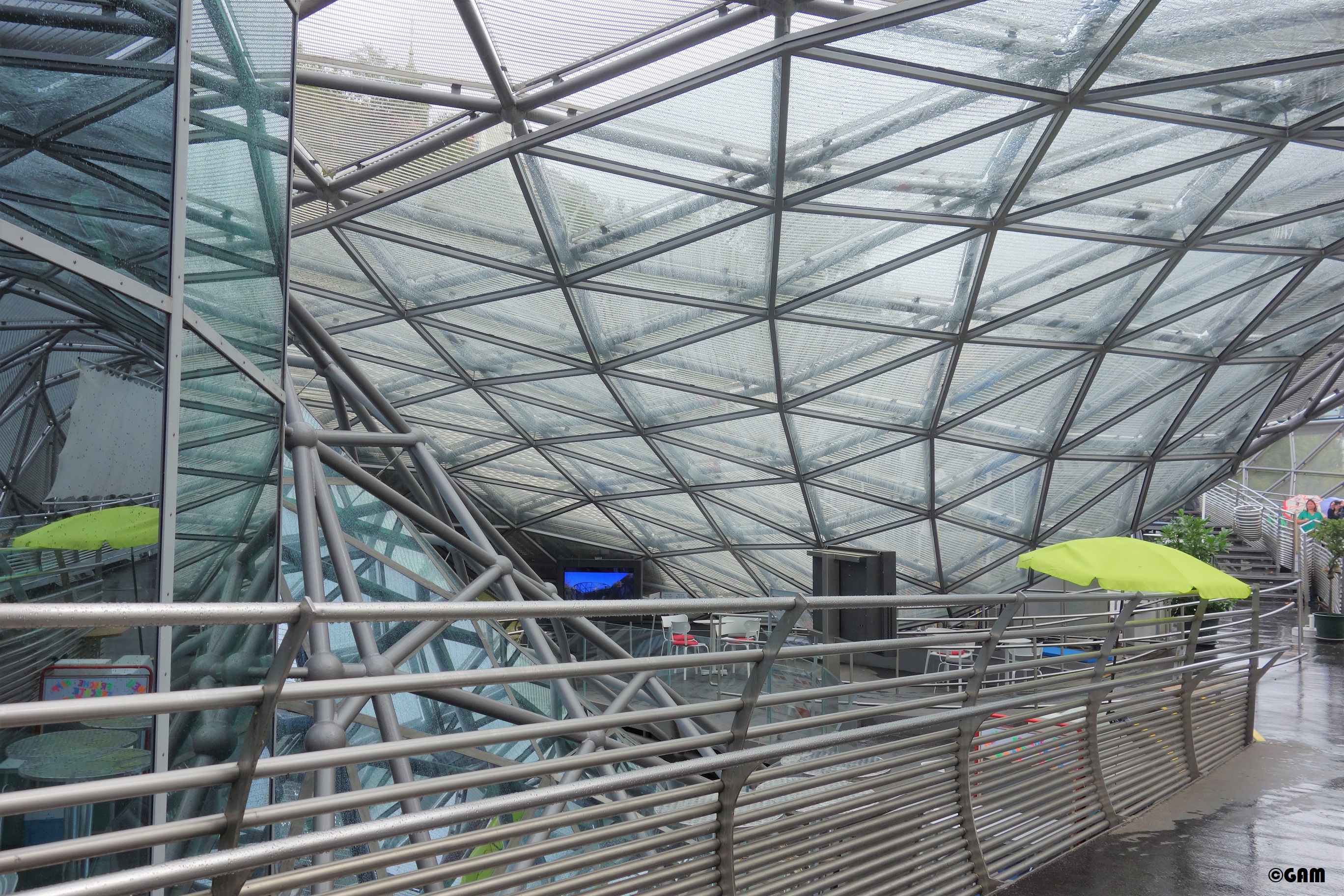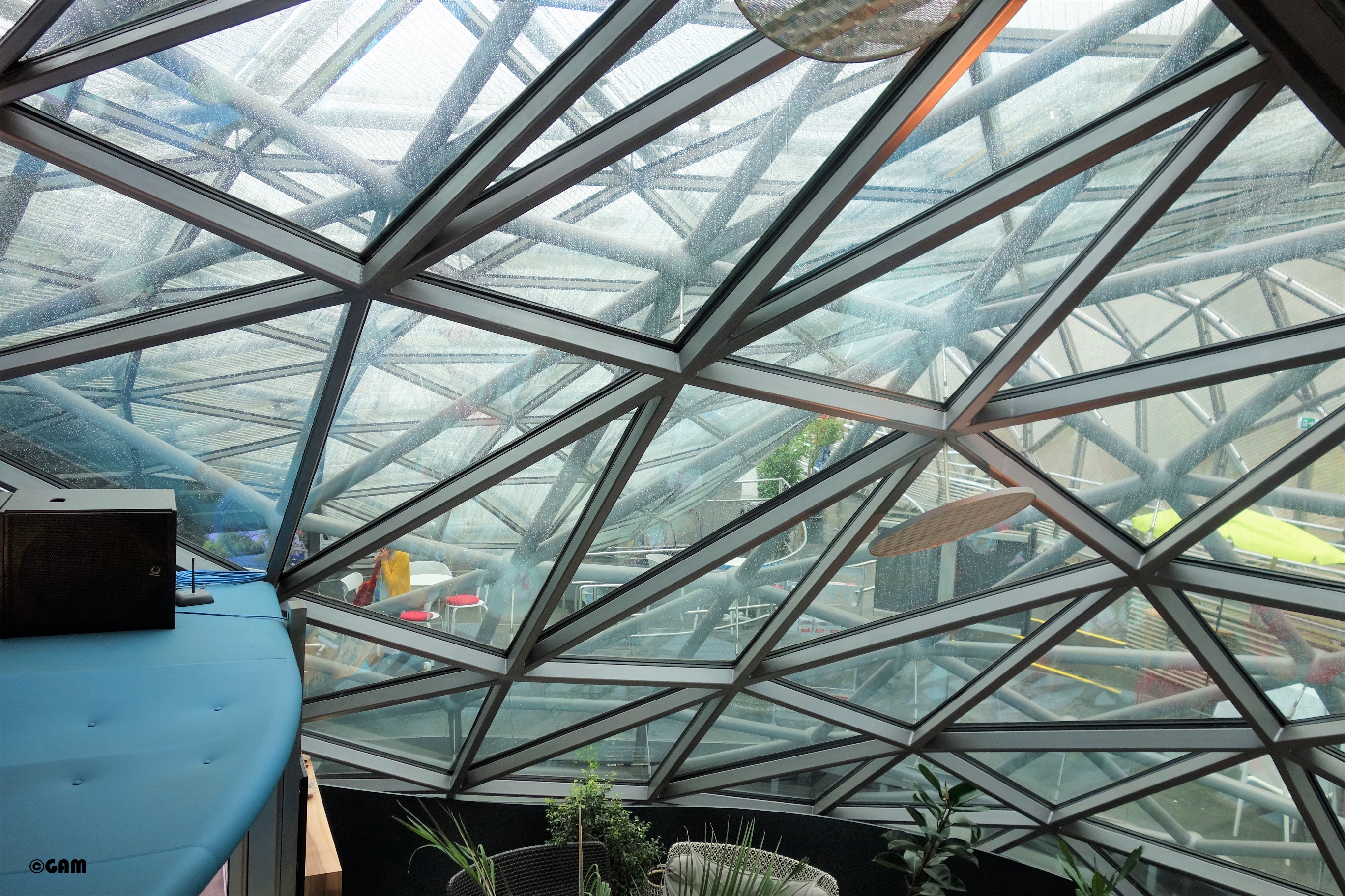 According to Robert Punkenhofer, founder and director of Graz Art and Creativity, New York artist and designer Vito Acconci created a spectacular object: a 50-metre-long, 20-metre-wide shell-shaped object with combination of an amphitheatre and a circular “Dom” (the artist calls it a cathedral-like dome). The artificial landscape is interspersed with dome and shell motifs, and can accommodate 350 visitors. This art platform allows anyone to communicate with the arts. The Murinsel is like a ship anchored in the river. The exterior is made up of two staggered bowl-shaped steel meshes, one facing upwards and one facing down, with indoor space, like yin and yang. This tai-chi design concept completely subverts the established concept of the theatre building. Inside the “Dom” there is a cafe (Island Cafe) and a children’s playground. The sky-blue floor in the cafe, the white tables and chairs and the palm trees are eye-catching. They made me feel the illusion of a tropical island club. The design of the blue glass adds some mystery. The area of the theatre is also dominated by sky blue and white design, which is much lighter compared to a large amount of stainless steel.