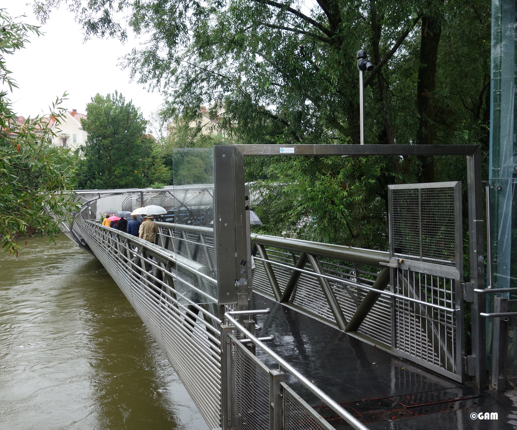 Another planning project involves the flow behaviour of the Mur River: on the north side of the platform, the impact protection of the floating objects should be strengthened. The flood on July 21, 2012 (levels peaked at 6.4 meters) forced the island to be closed for one day. Although the anchorage on the island remains stable, if the hull of the platform were suddenly to be hit by a floating log of 3 metres or more, the water may still leak in.