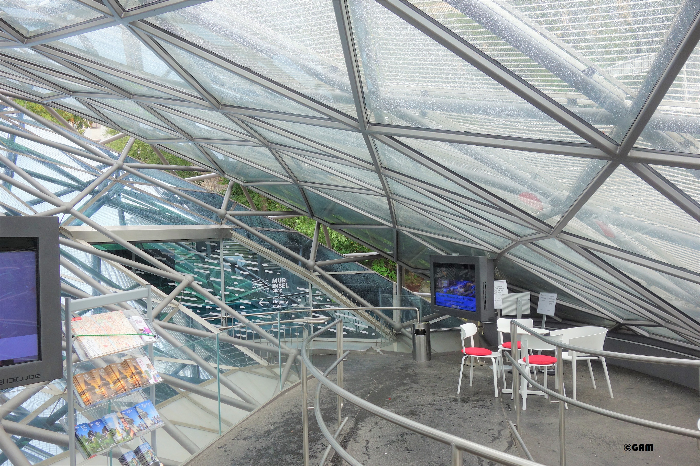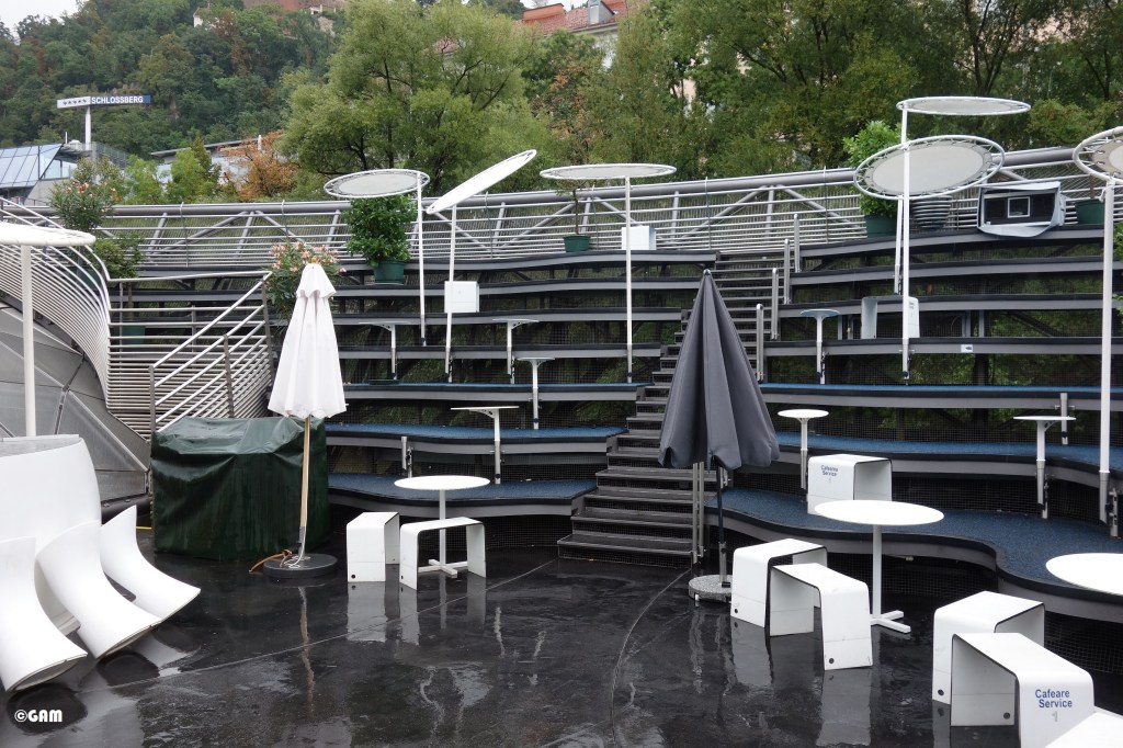 The highlight of the new design Murinsel is the newly refurbished cafe, showroom and shop area of the upper design store. Unfortunately, the children’s play area was replaced by the shop. In the outdoor area, the information screen informs visitors of local art, culture, science and design news.
