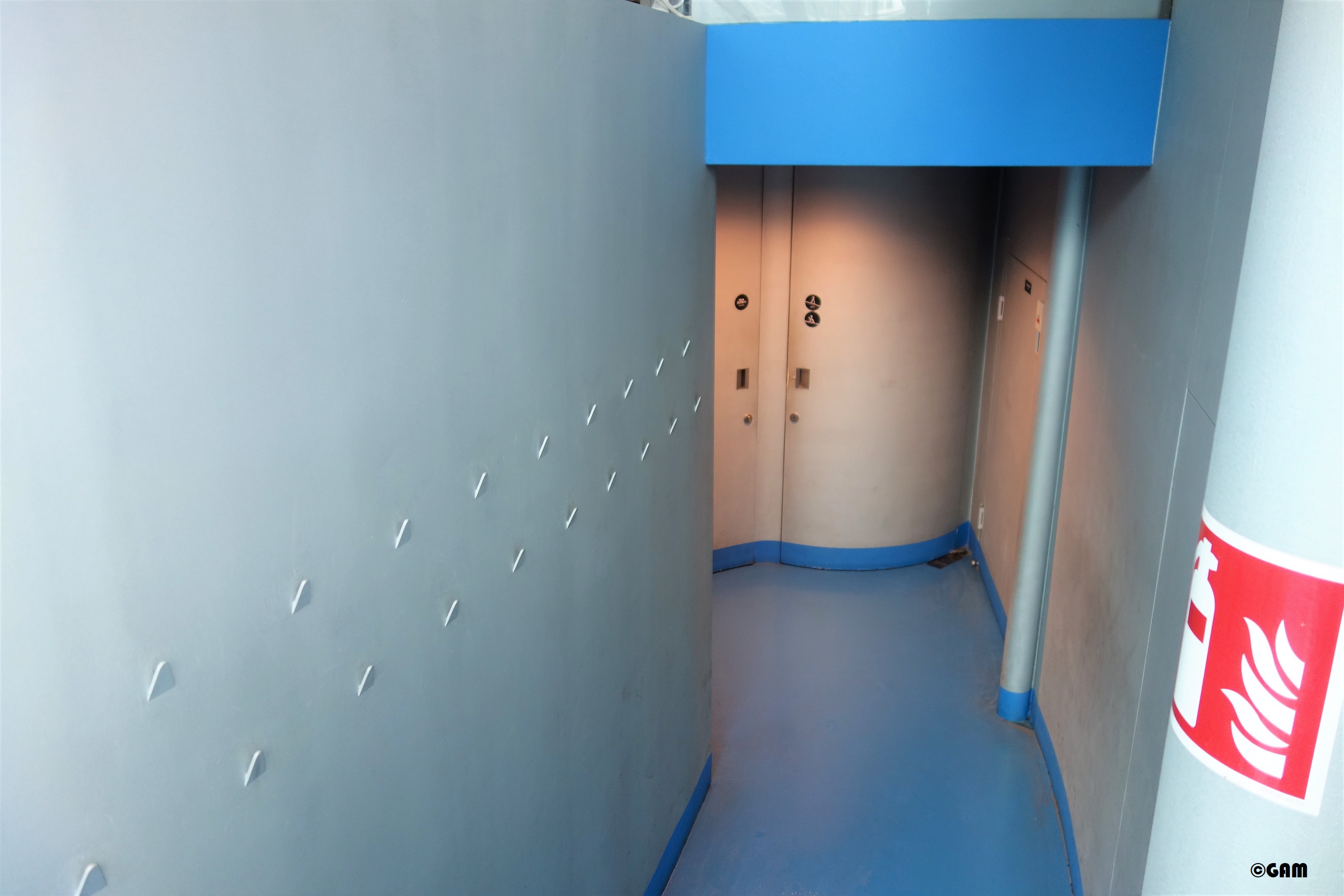 Sky-blue staris between shop and cafe.