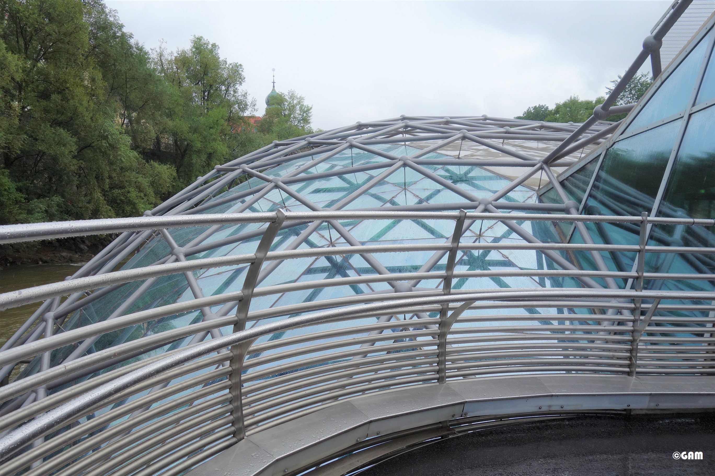 在奧地利會讓我想到陰陽之美的竟然是一個原本該短暫存在的橋或稱為格拉茲木耳島- Murinsel Graz. 這個在格拉茲的地標是在木耳河中一個人造的飄浮平台。它於1999年規劃完成,建於2002年,於2003年1月在格拉茨中部的木耳河開放。是為了歐洲文化之都年(格拉茨2003年)期間在城堡山旁邊創造了該城市的第二個現代地標而產生的作品, 和在旁邊的現代藝術館(Kunsthaus Graz) 相輔相成。項目運營商的目標是將公共空間的建築和藝術與城市中心的水體驗相結合。