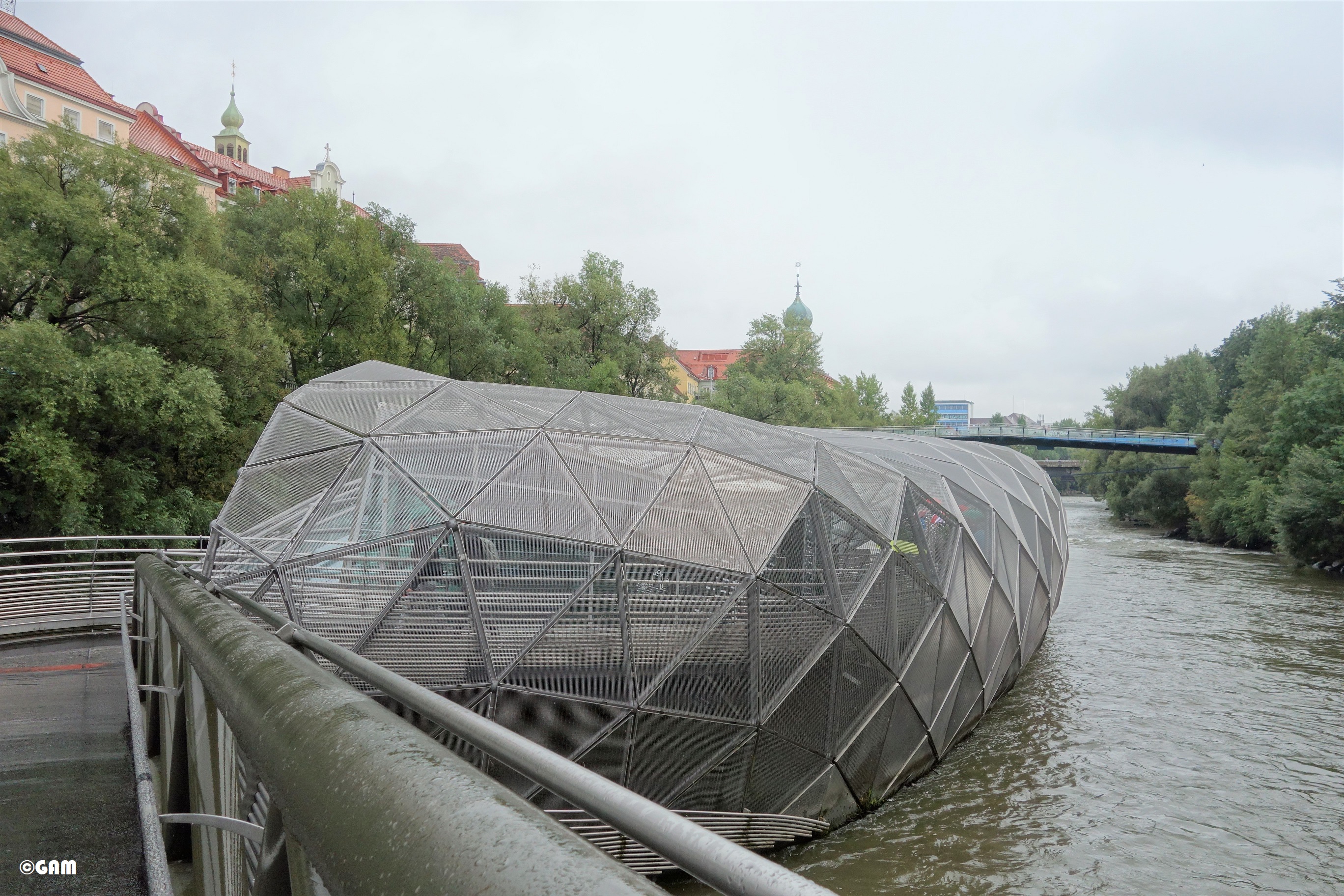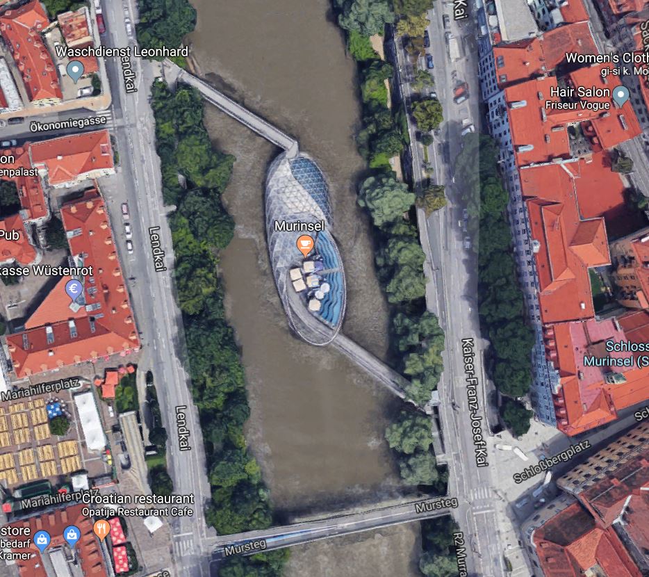 The “Island” is located on the upper side of the Edegger footbridge, on the north side of the main bridge, between Castle Hill (Schloßberg) and the Kunsthaus Graz. The linked bridge spans the Mur River.