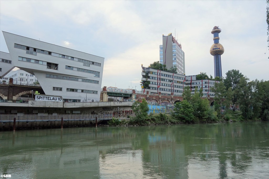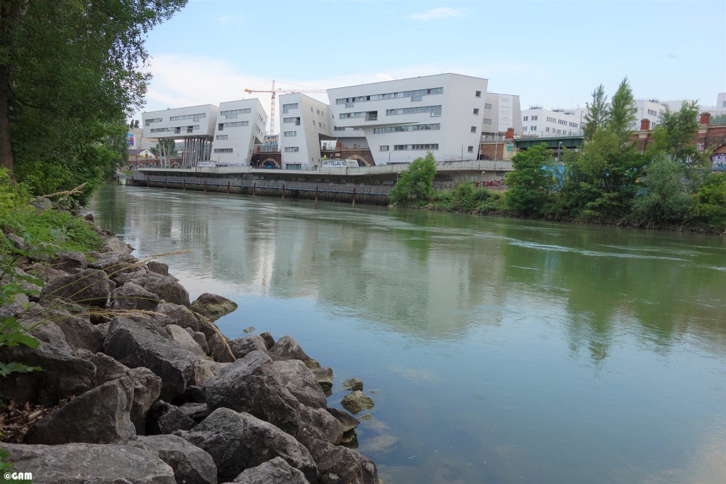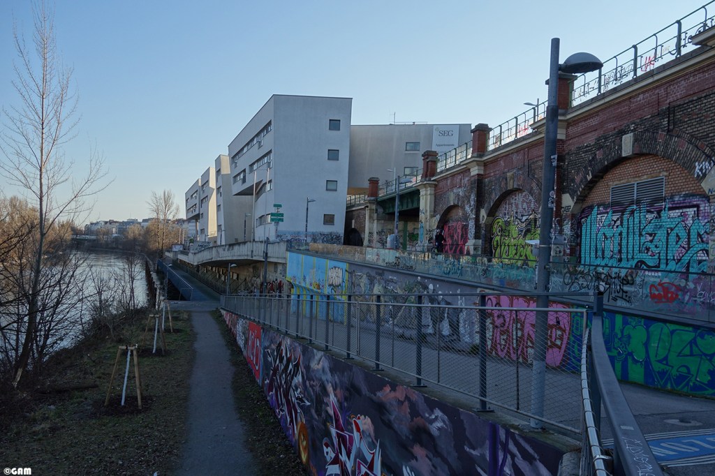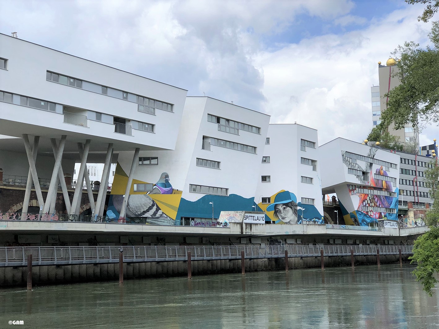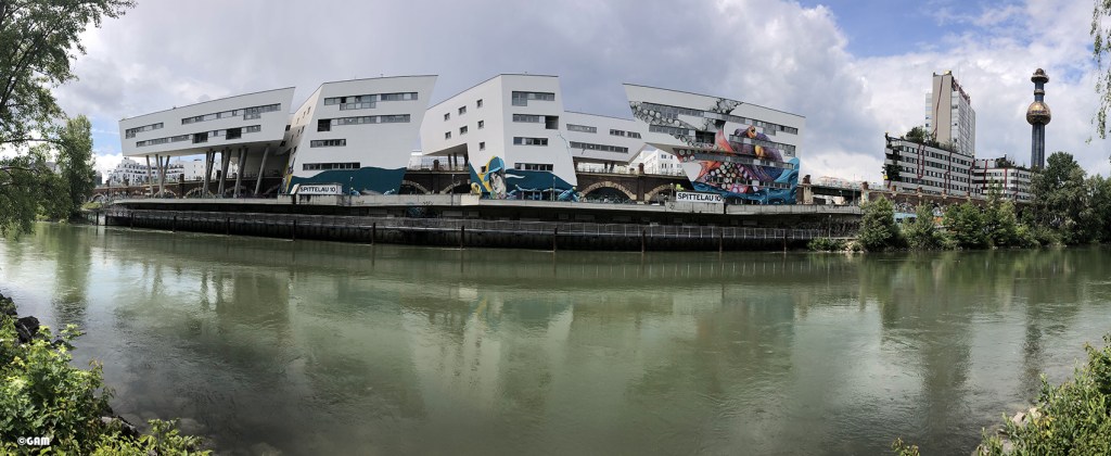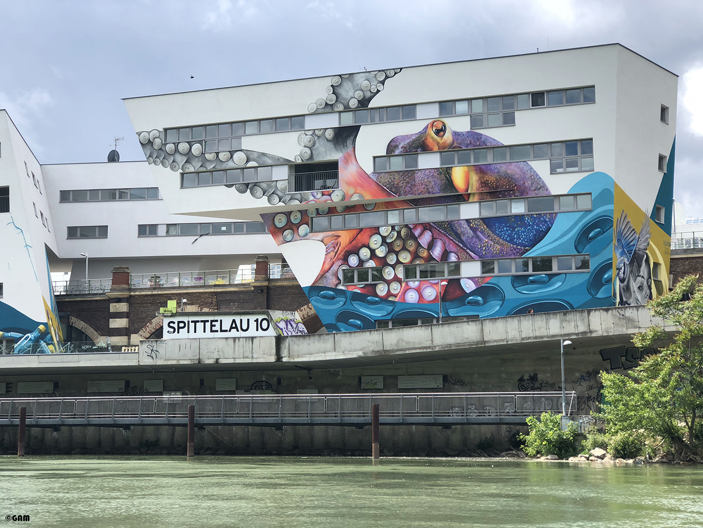 2020年5月中我去多瑙水道附近散步時,意外發現這群建築物竟然上面有大型塗鴉。上網查了一下原來是新開發商邀請塗鴉藝術家來打造都市島嶼(Urban Island)。他們計劃打造一個都市型態的藝術熱點。巨大的章魚,浮瓶傳信,還有鴿子是想傳達都市訊息的象徵。