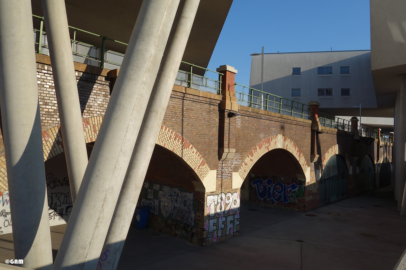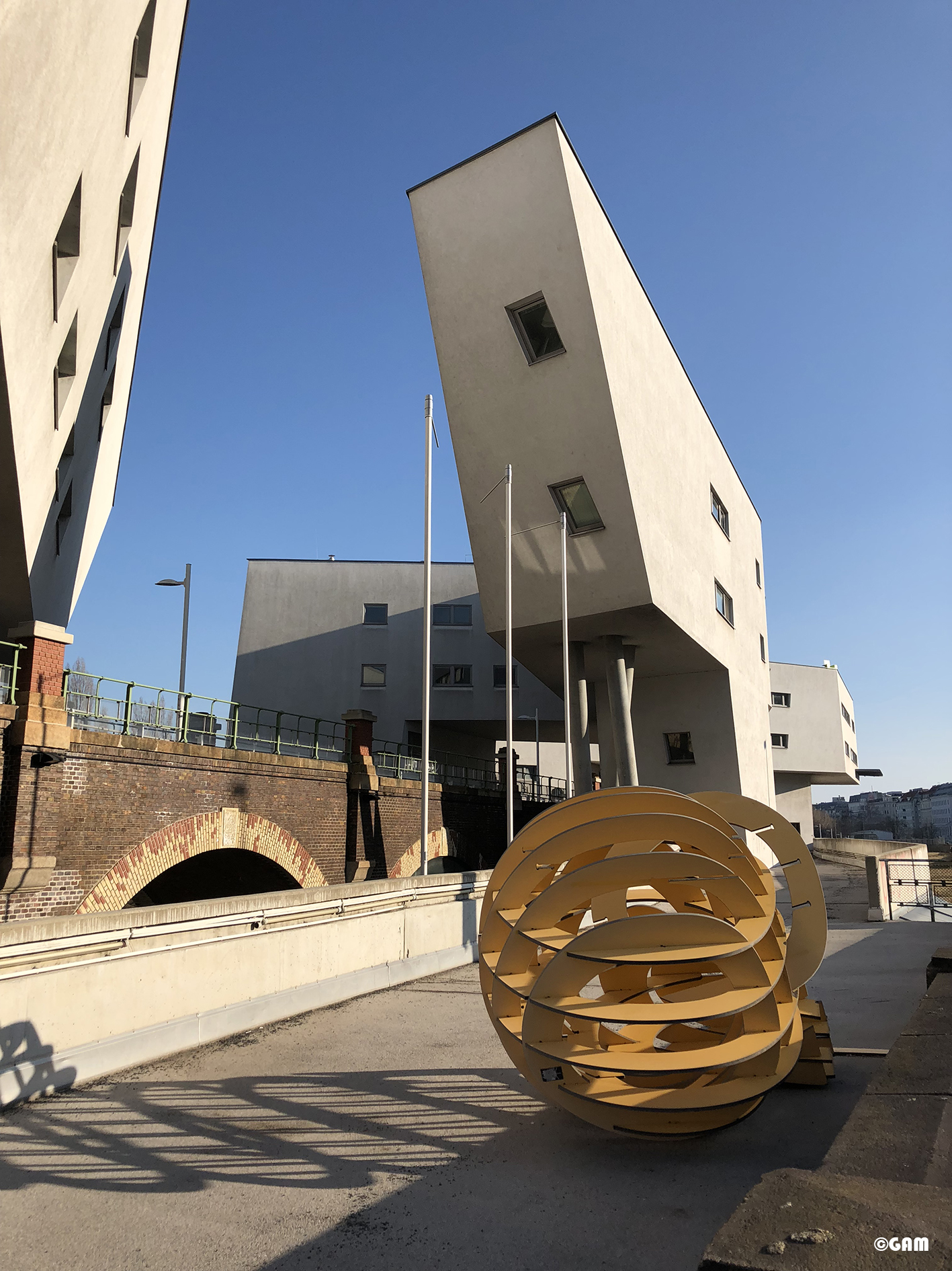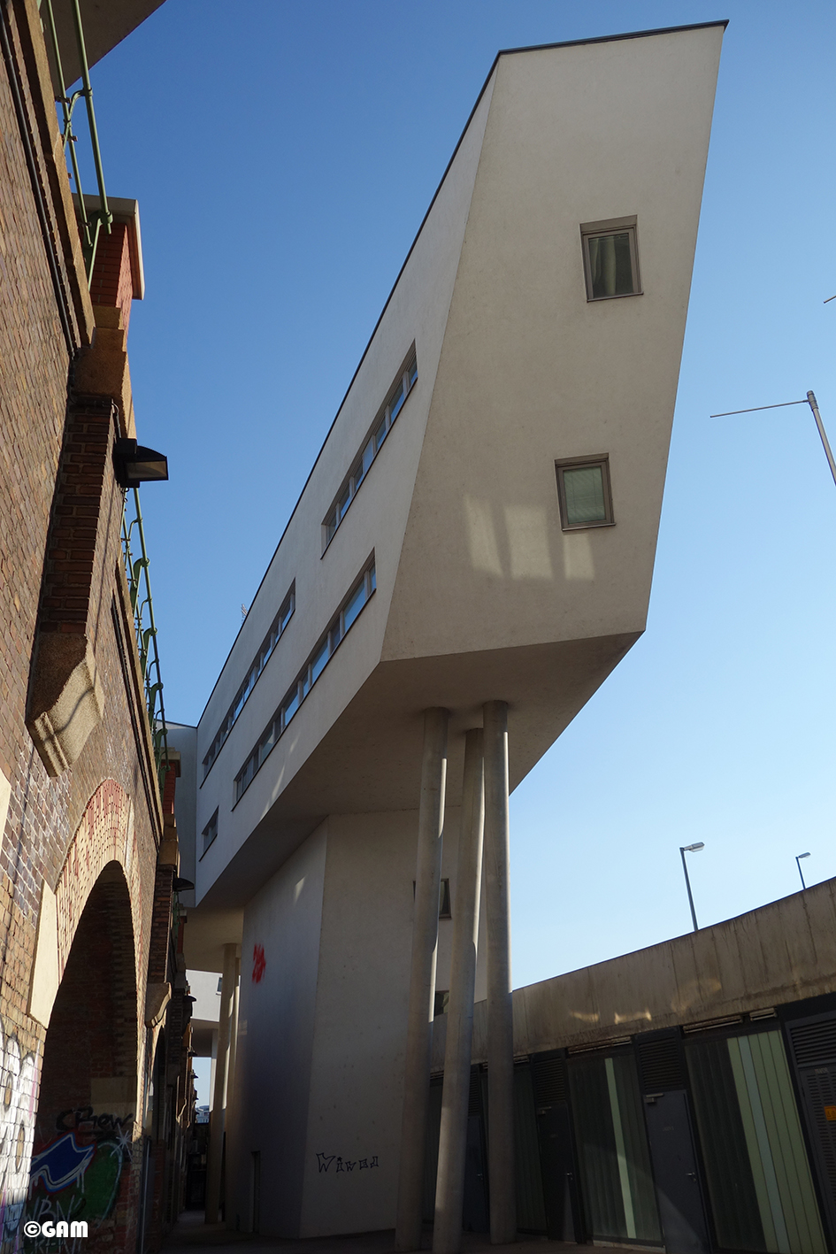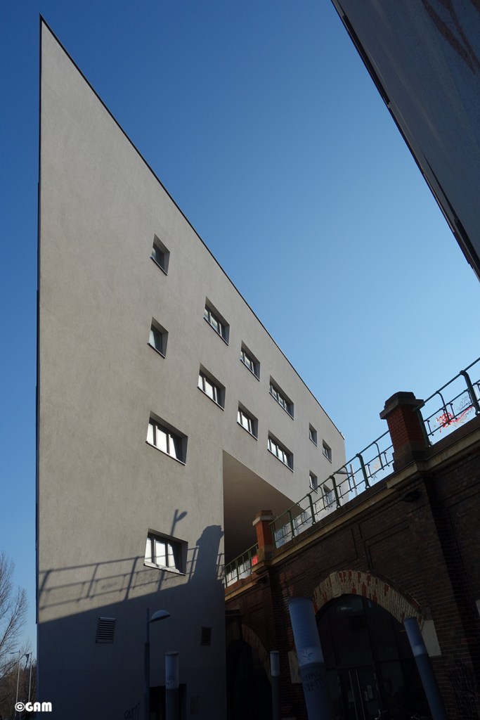 這一個建築物中除了公寓之外,還有辦公室和藝術家工作室。這些空間像一條絲帶,有趣的穿梭,環繞著或跨越著高架橋拱。產生了互相交織,多變的室內及室外空間關係。舊的紅色磚頭橋拱及新的白色建築形成有張力的對話。光和影的交錯在這裡像在捉迷藏。