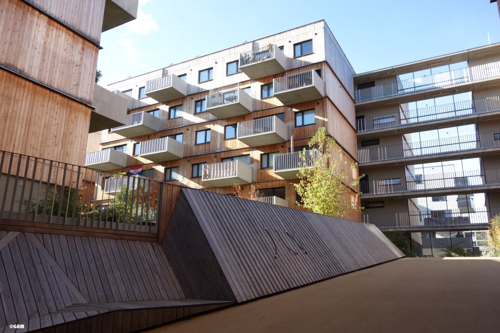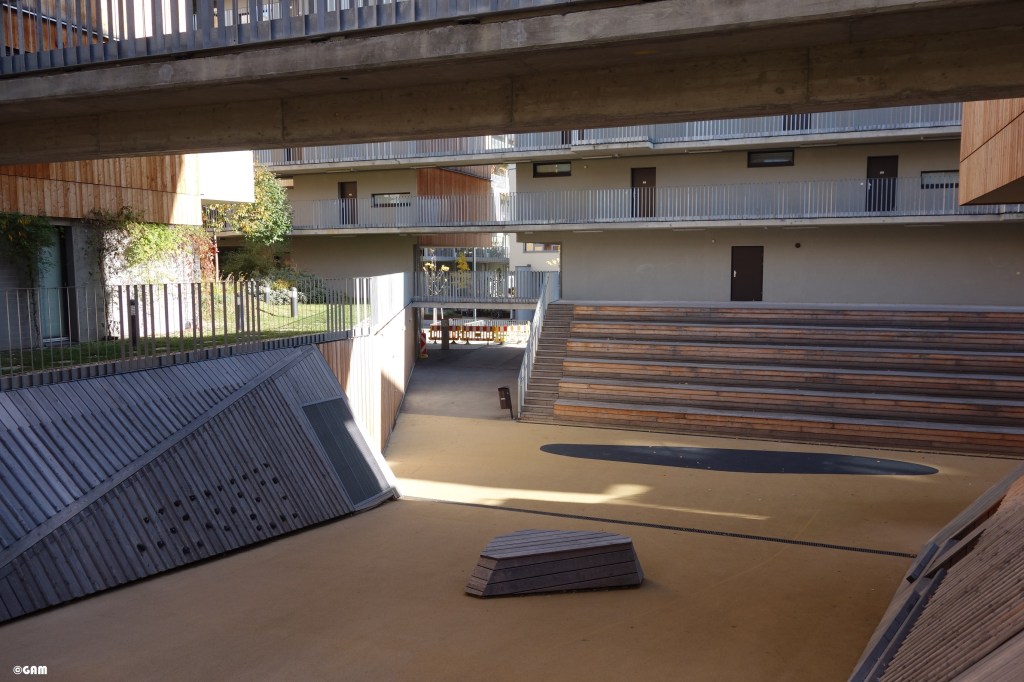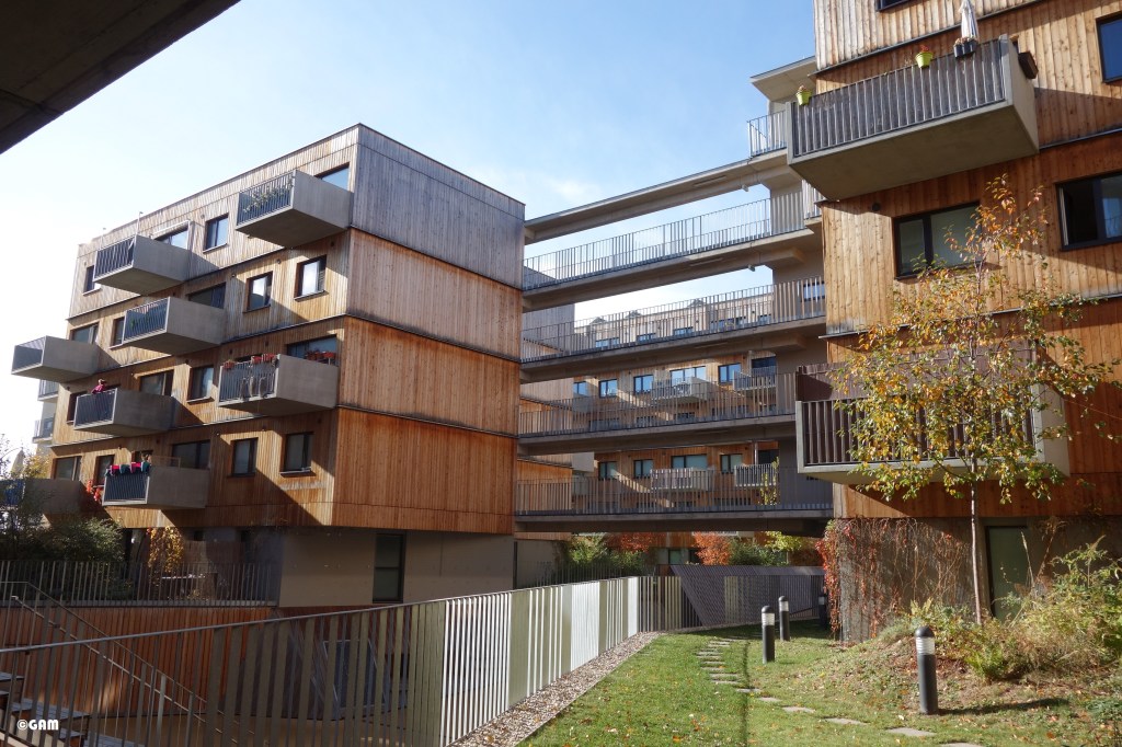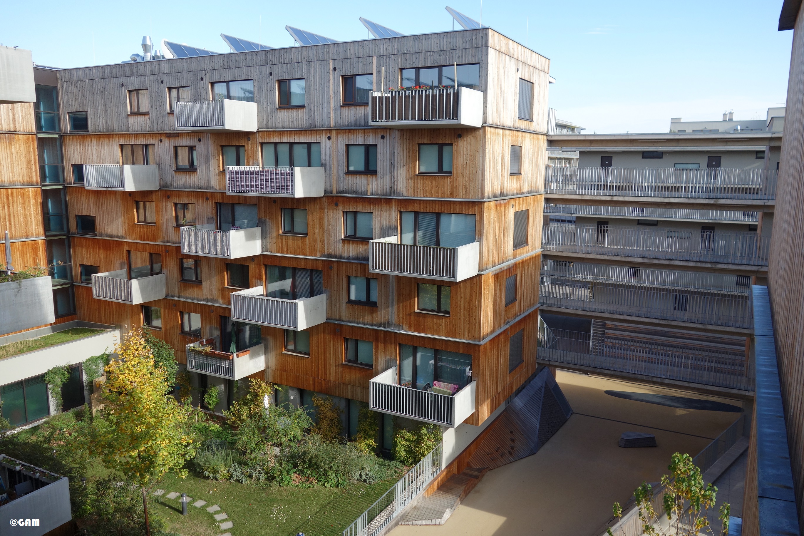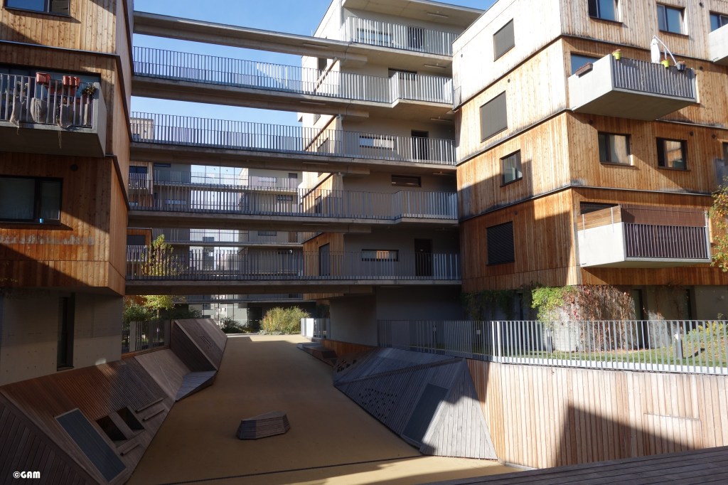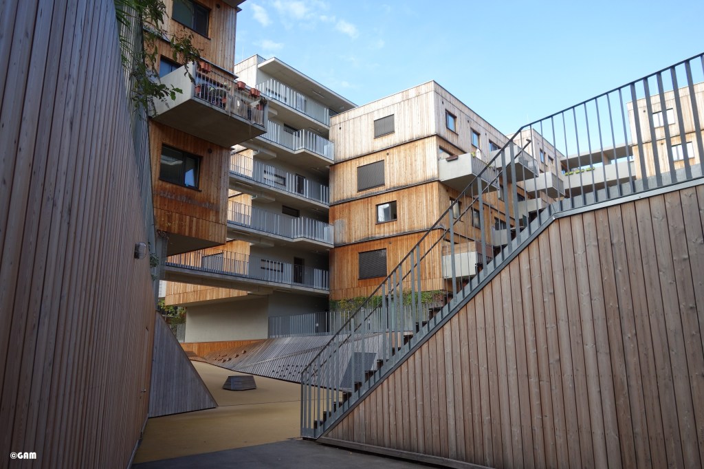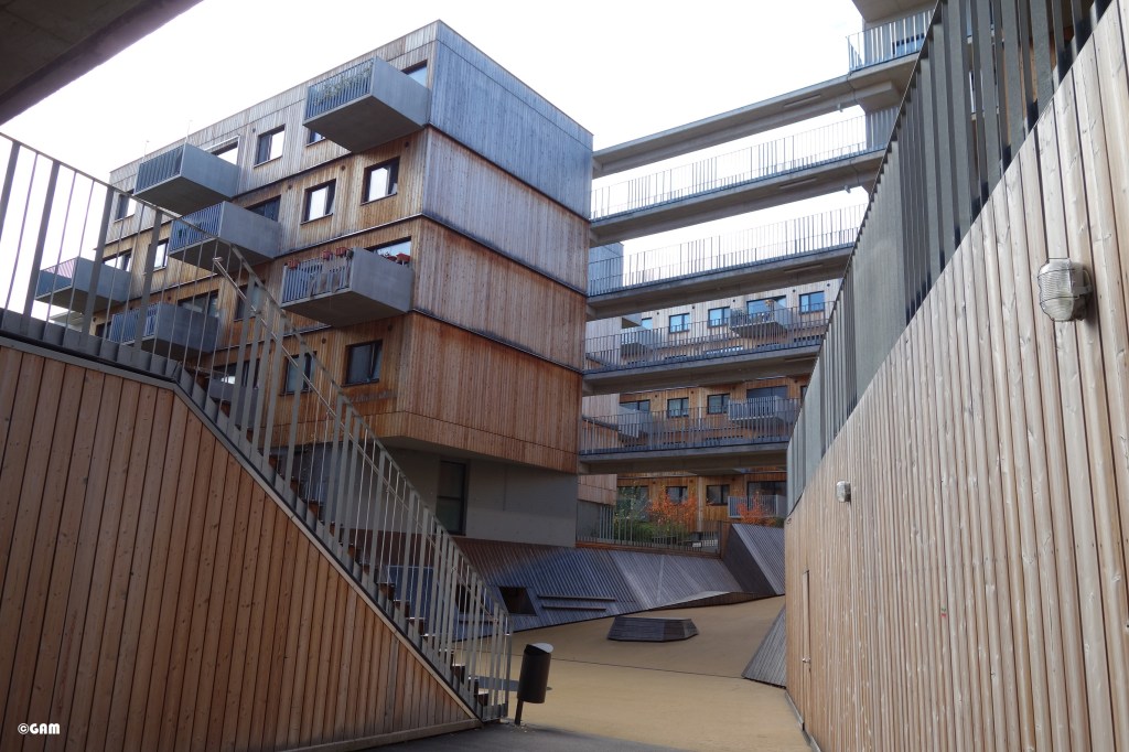 中庭綠化營造出小型氣候能冬暖夏涼,峽谷式公共空間設計結合兒童遊樂區,景觀穿梭不同的空間。住宅設計上是複合式住宅加上底樓的小型工作室,讓自由工作者能在那新社區開始小型事業基礎。彈性的空間使用是他們建築設計的重點之一。每個入口和樓梯間建築師挑選不同的勒·柯比意Le Corbusier多樣性色板。