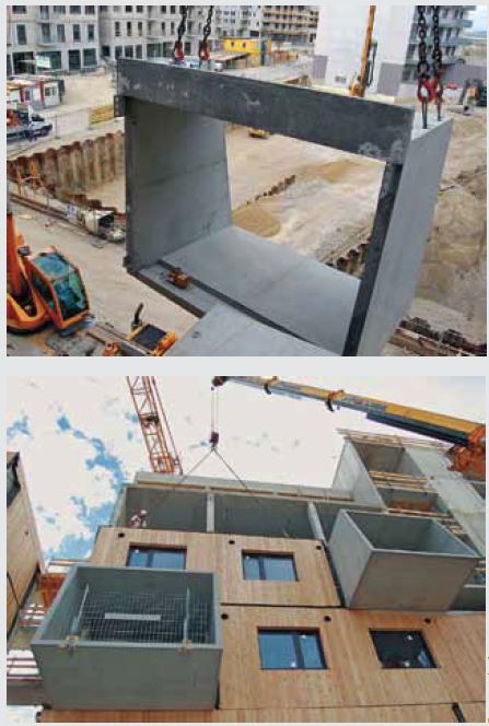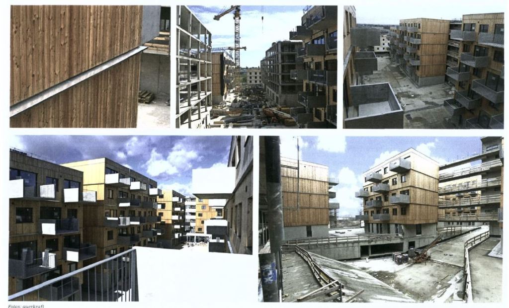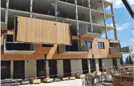 專案的建築師Robert Haranza和我說,他們開工前必須先通過建造影響評價審查。因為同時有多個工地在同一區建造,所以有規劃一個共用的水泥混合設備減少水泥車來回跑時二氧化碳的排放。為了減低工地施工產生的噪音還有降低成本及縮短施工時間,他們使用預制建造方式。外牆部分及涼廊水泥框能像拼圖似的在短時間組裝。木材及礦棉絕熱材料的牆壁組合不僅是二氧化碳減量的建材,厚度上比傳統的鋼筋水泥造法少了10公分,因此還增加了室內使用面積。