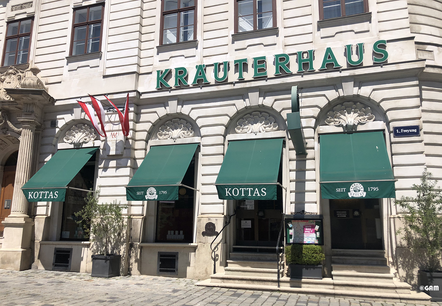 先帶領大家走到鋪著鵝卵石的弗賴雲廣場(Freyung) , 位在維也納市中心最美麗的廣場之一。四周是蜿蜒曲折的街道。馬蹄聲與許多熱鬧的市場攤位、藝術或漫步的人的喧囂聲交織在一起。附近的建築具有中世紀浪漫主義的外觀。這個氛圍將我們帶入奧匈帝國,也是當科塔斯碩士天然藥草屋1795年開業的時代。