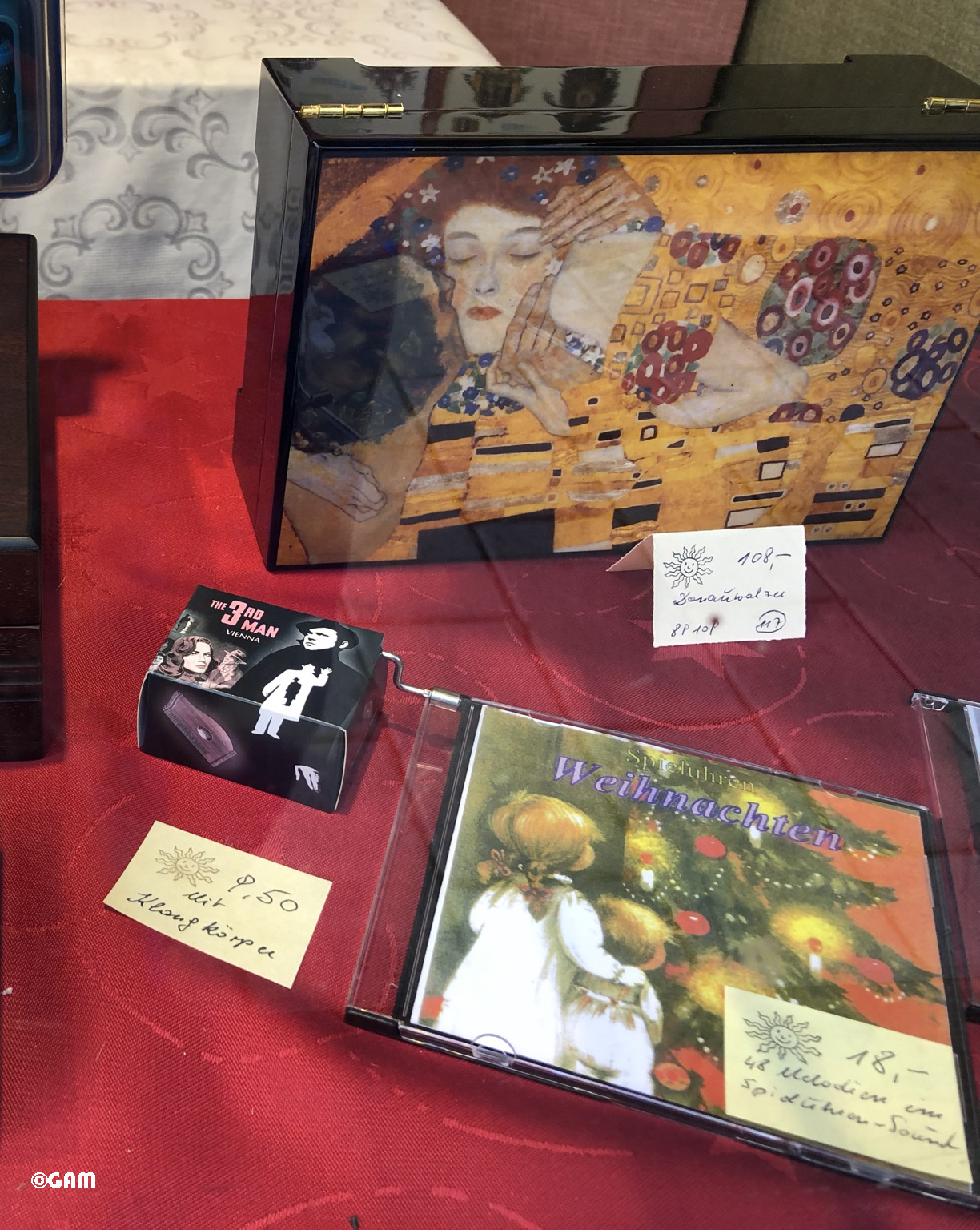 另一種伴手禮是主題迷你音樂盒,雖然只有一首曲子,但是可以選擇和維也納有關聯的經典電影配樂,例如黑獄亡魂(英語:The Third Man)的主題曲 (關於這部電影在這有描述)。非常推薦充滿故事的音樂小物(9.5歐元) ,只要音樂一開始,馬上就有在維也納的感覺了!