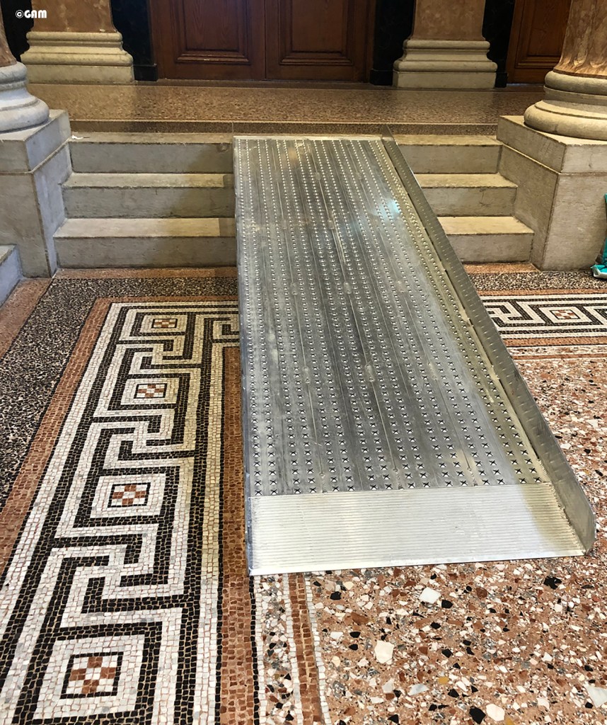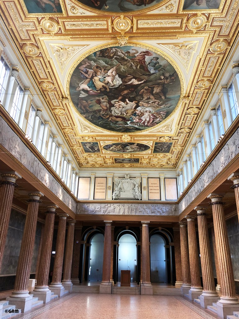 當然所有建築的專業知識也不會漏掉,例如維也納法規規定公共建築物必須是無障礙空間,所以設計團隊花了很多心血改建,讓後門有新建的斜坡連接其他電梯等等。清潔整修好的畫廊大廳(Gemäldegalerie)金碧輝煌讓人讚嘆不已,已經有不少網紅來打卡了。