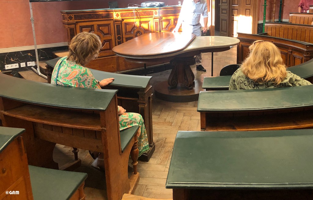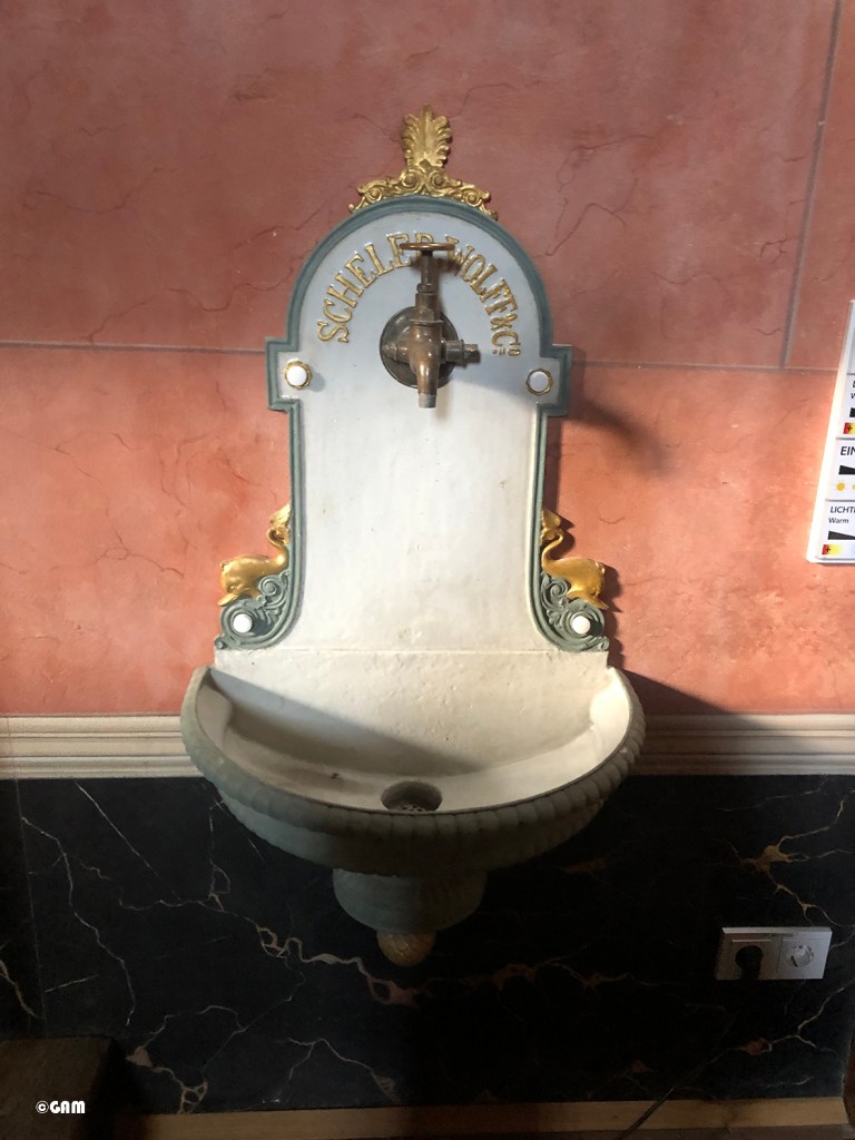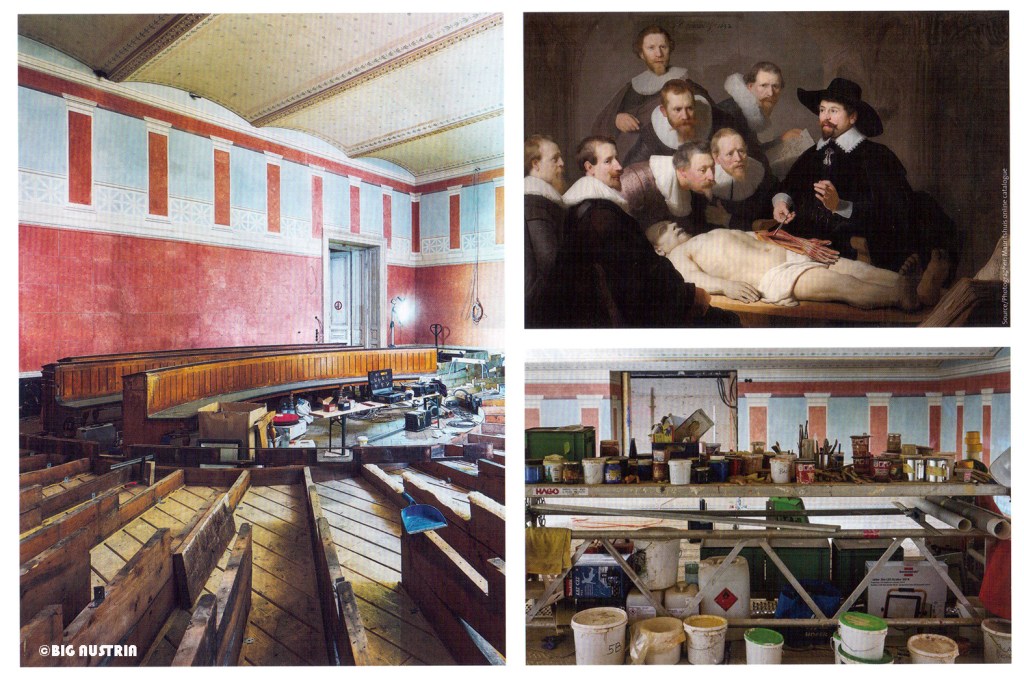 負責整修項目的建築師帶領我們志工團先偷窺解剖室( Anatomiesaal) !!! 是的,有點毛骨悚然的地方啊! 然而當時學習繪畫要了解人體構造是不能隨便去找個人體來切割研究的 (現在也還是這樣) 。1632年荷蘭畫家林布蘭(Rembrandt)完成的油畫,尼古拉斯·杜爾博士的解剖學課,最能表達當時人們對人體構造好奇的程度。解剖桌最上方的木板能夠旋轉,露出大理石的下層桌面,最讓人匪夷所思的是桌子中暗藏的排水孔到底是通到哪裡? 加冷筍啊!