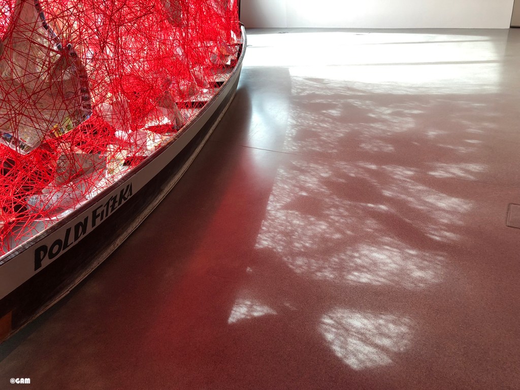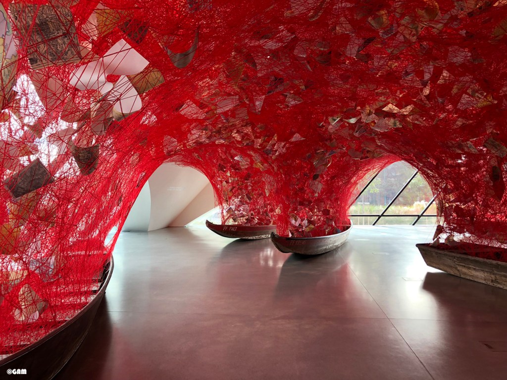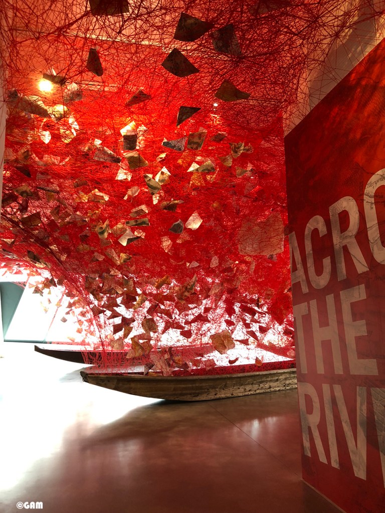 在一樓光線明亮的展覽室裡,我體驗到日本藝術家塩田千春Chiharu Shiota的裝置藝術,過河 (ACROSS THE RIVER)。