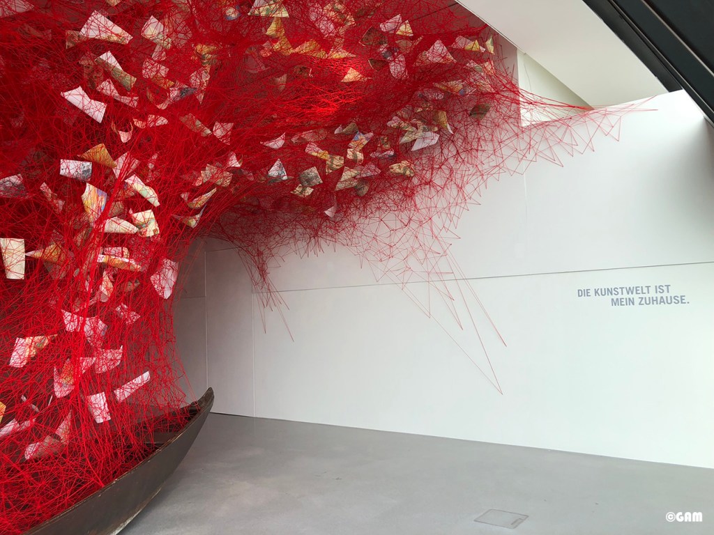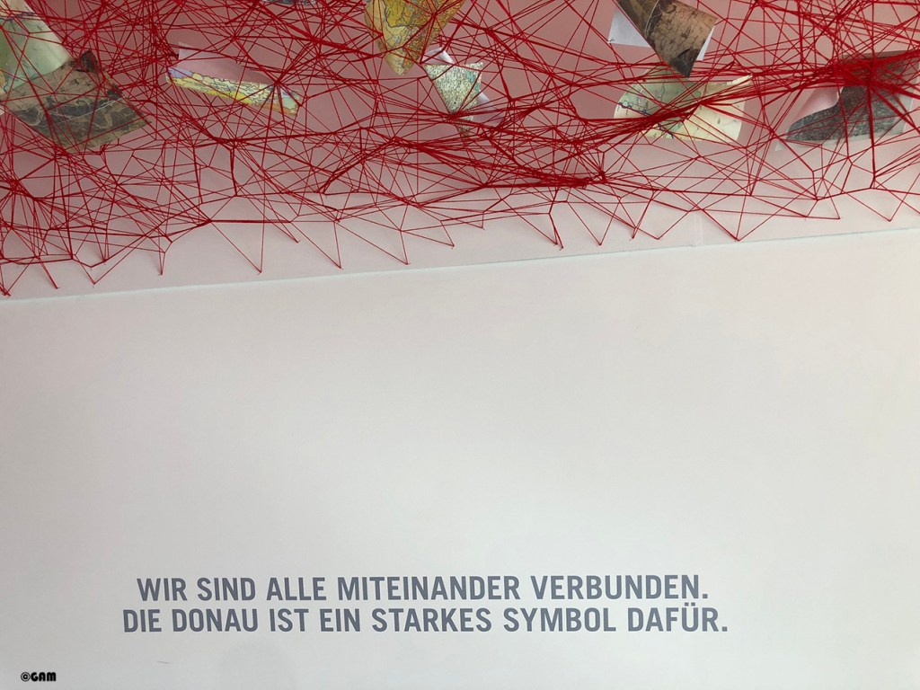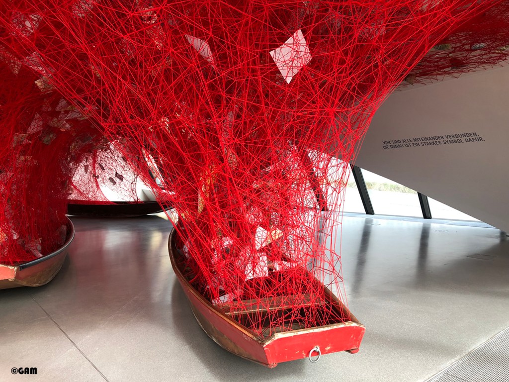 塩田千春用紅色羊毛線拉出一張密集的網,將不同的平底船相連。這種船隻(Zillen)在瓦豪(Wachau)很常見。對她來說,船是旅行的象徵。多瑙河流經14個歐洲國家,可以跨越國界,將人們聚集在一起。藝術家使用多瑙河地區的各種歷史地圖,分散的被編織在羊毛線網中,強化了這一個構想。