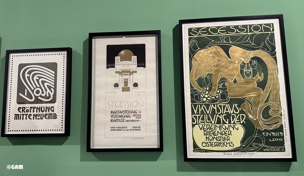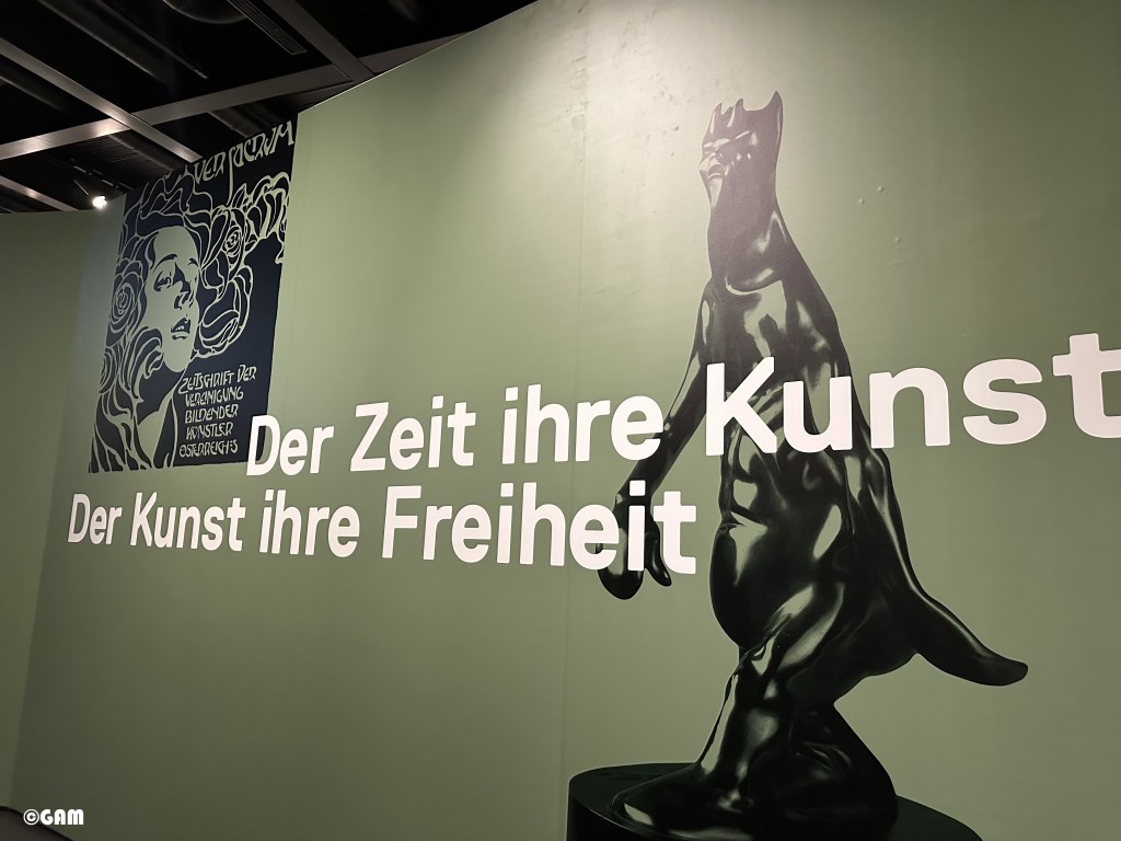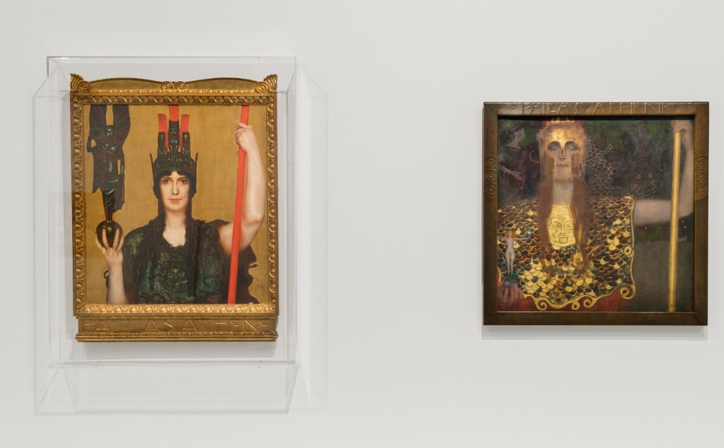 我印象最深的是兩幅對比的雅典娜畫像。穿者金光閃閃盔甲的女神象徵新藝術的守護者,也是智慧女神。左邊是弗朗茨·馮·斯塔克的作品,右邊是古斯塔夫·克里姆特的詮釋。請仔細看看,有找到克里姆特在盔甲上畫吐舌頭嗎? 這調皮的細節就是藝術家對保守派抗議的表達。是不是畫中有話?